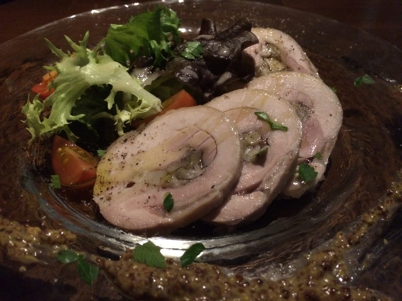 味に深みのある古白鶏を使用。古白鶏でキノコとチーズを巻きました✨イタリア風チキンロールです。おつまみにピッタリ(^^)