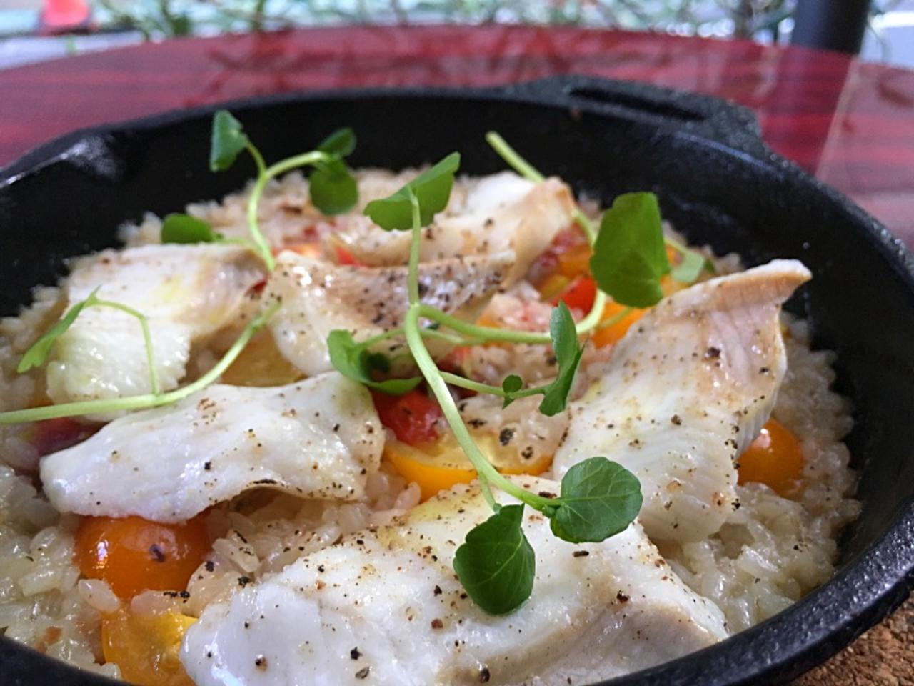 函館直送☆新鮮でフワフワなアイナメとミニトマトのパエリア‼︎ 暑さでバテ気味の胃袋に優しい、出汁を生かした一品です。 恵比寿スペイン&イタリアン Wine&Grill BaruComodo