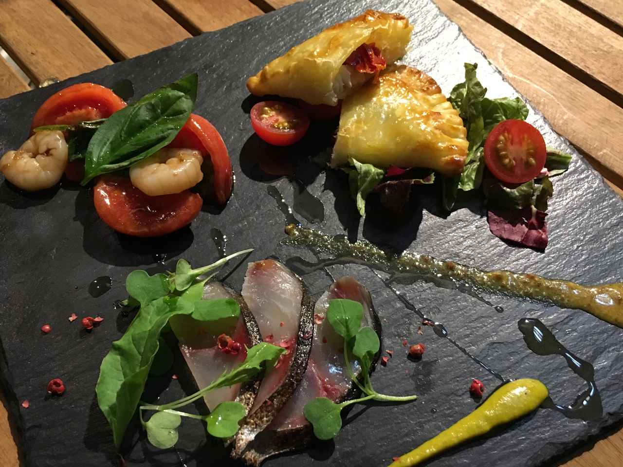 本日の盛り合わせは… 新鮮魚介のタパス3点盛り合わせ ◆アイナメとモッツァレラのパイ包み焼き ◆鯖のシトラスマリネ ◆小海老とフルーツトマトのバルサミコマリネ